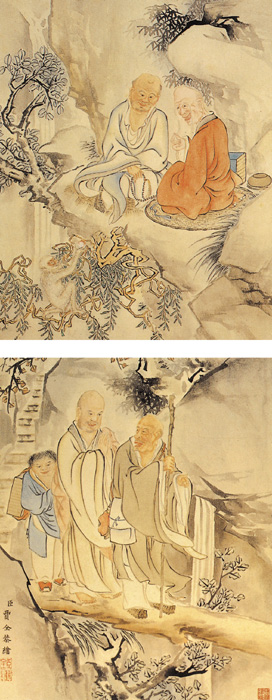 贾全,生卒年不详,乾隆时供奉内廷。工画人物及马。此册画不同形象的罗汉十六尊。佛像采用中国传统人物画技法,勾线填色。人物神态平和,面部晕染有致,衣纹流畅,背景简率。