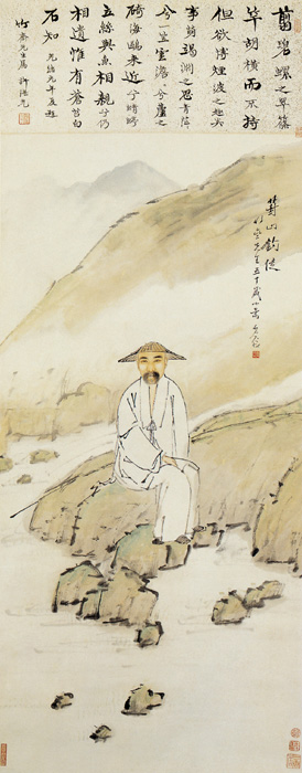坡陀泉石间,画沈麟元头戴斗笠,身著白短裤衣服,留着短发坐在石上,作观水沉思状,身后放着渔竿,以点破主题,画右上方自题“葑山钓徒。竹斋先生五十岁小景,虚谷。”下钤“虚谷”朱方印。画中人物神态悠闲,形象生动逼真。全画笔法冷峭超逸,别具一格。可称虚谷肖像画的代表作品。沈麟元,字竹斋,一字卓哉,钱塘(今杭州)人。清同治至光绪年间(1862—1908)官河南淅川厅同知,善书,工山水,笔力苍劲,书风似奚岗,与虚谷同时代人。