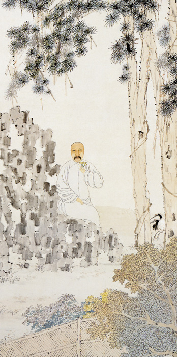 此图画一长袍老者手执菊花,倚坐于湖石块累上。庭院中双松挺拔,茂郁苍翠,松下两只白鹤在绿荫间闲步。竹篱边,秋树葱茏,丛菊盛开。画家很注重人物面目的刻划,勾染笔笔精到,墨色渲染过度,虚实对此清晰自然,很好地把握住了主人公面容丰满、神态闲适的特征,加上流畅简洁的衣纹和松鹤花石的映现,更显示出“人淡如菊”、儒雅持重的精神风貌。