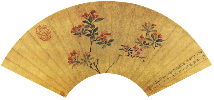 陆治(1496—1577),字叔平,吴(今江苏苏州)人,居太湖包山,因号包山子。擅花鸟,工笔、写意均能,人谓得徐、黄遗意。陆治花鸟画的风格,王世贞曾将他与陈道复、周之冕做过一个比较: “胜国以来,写花草者,无如吾吴郡,而吴郡自沈启南之后,无如陈道复,陆叔平;然道复妙而不真,叔平真而不妙,周之冕似能兼撮二子之长。”可说是道出了陈重写意,陆重写实,而周是“勾花点叶”的兼工带写的不同风格。此画是陆治的花卉扇面画,除了扇面画所特有的构图严谨之外,在艺术表现上也具有非凡魅力。
