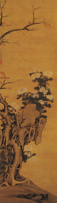 此画构图平稳、平而不板,赋色明艳,艳而不俗。图上绘秋天的黄栌,在秋风中日渐火红,金黄的菊花与黄栌的红叶穿插于太湖石中,构成了画面的热烈而浓丽的氛围。在表现技法上,画家以水墨勾勒皴染作山石,用没骨法间以勾花点叶写菊花、红叶,与山石形成对比。