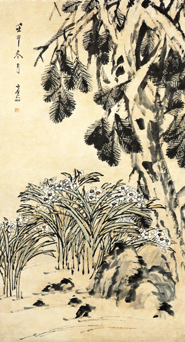 此图绘古松欹斜,溪流涓涓,盛开的水仙花丛生石旁。松树与水仙一高一低,一墨一色,相互呼应衬托。松树苍老、挺拔;水仙葱翠、鲜丽,形成质感上的对比。此图独特的构思与绘画题材表达了作者追求孤高芳洁的情操。款署:“壬申冬月,虚谷。”印“虚谷书画”。当作于公元1872年。