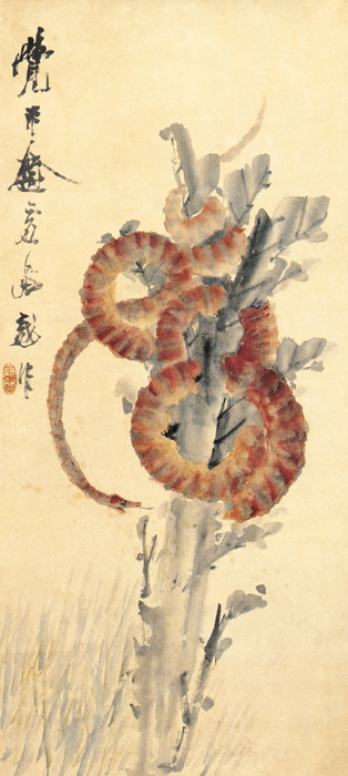 画上画家自识“觉非 虚谷戏作”,钤“三十七峰草堂”朱文椭圆印。此图绘深草间一条纹彩斑斓的赤练蛇,蛇身盘踞在老树枝叶间,虬结扭曲,形态怪异,蛇头下探,长信频吐,双目炯炯,似在回首威吓近敌。用笔肆纵,设色对比强烈,更映衬出蛇的狰狞恐怖。虚谷喜作赤练蛇,在画史上是罕有先例的。这题材多见于他早年的作品中,显示了他“性癖又好奇,书画破常规”的独特艺术性格。