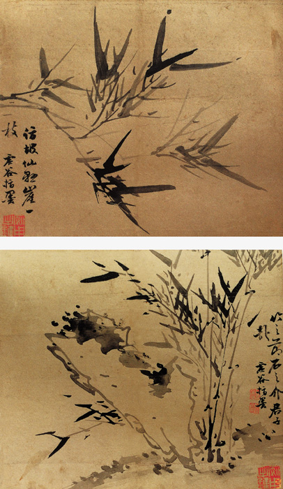 虚谷此《竹册》,共十二开,前六开为书法,后六开为风竹。画幅虽小却妙趣横溢。画家笔致豪放, 取象造型, 重传神写意, 艺术概括力强, 还以草书笔法入画, 更见神力。