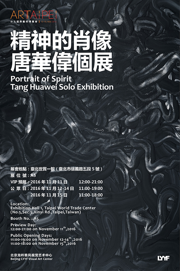 “精神的肖像-唐华伟个展”作为世界巡回展览计划,自2015年始分别在意大利米兰、德国科隆、中国台北、新加坡、中国香港、北京、日本东京、深圳等地陆续登场,此次登陆艺术台北是艺术家巡回展览的迂回站。“精神的肖像”系列作品以书法性的线条为最突出的形式语言,画面极具冲击力,色彩浓郁饱满。这是艺术家用自己的生命体验与特有的中国文化基因解构原本属于西方文明的油画语言,进而重新建构完全独立与独特的个性化绘画语言。