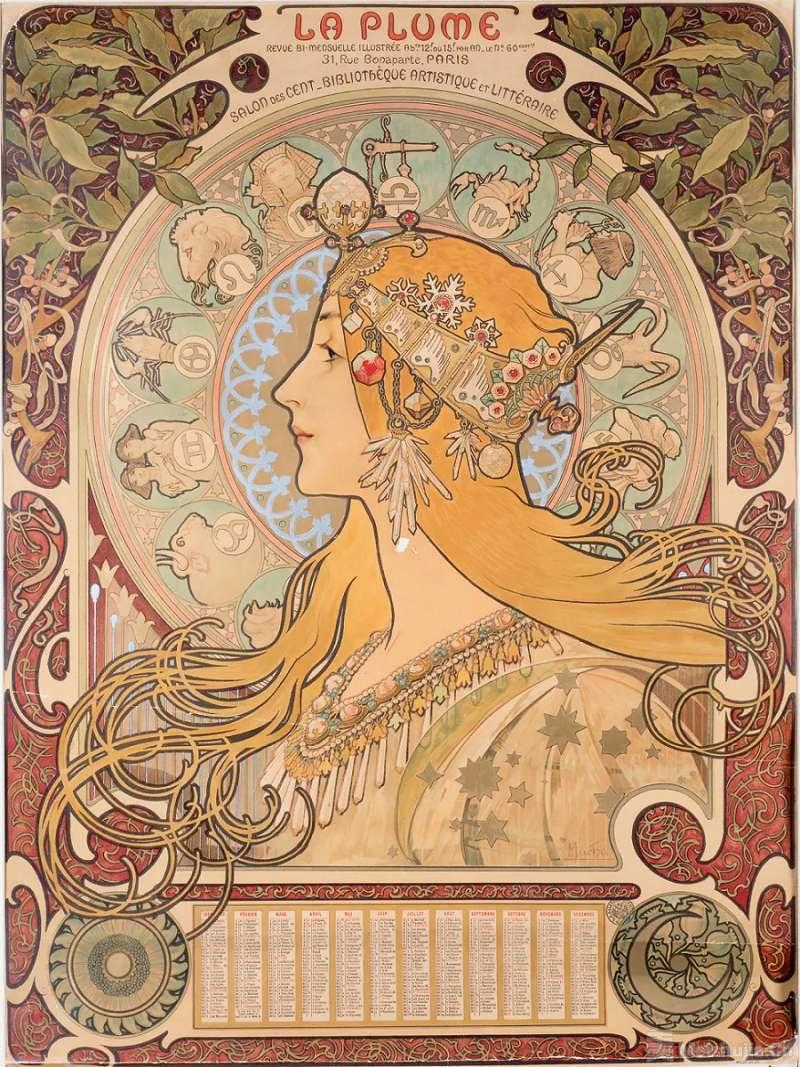 穆夏1860年生于捷克,是新艺术运动的先锋。他的创作涉及几乎所有艺术领域,涵盖油画、招贴画、雕塑、书籍插画、建筑设计、室内装饰、首饰设计、彩色玻璃窗画等,还有家具和咖啡壶等生活用品的设计、以及大量的商品包装纸等商业性绘画。