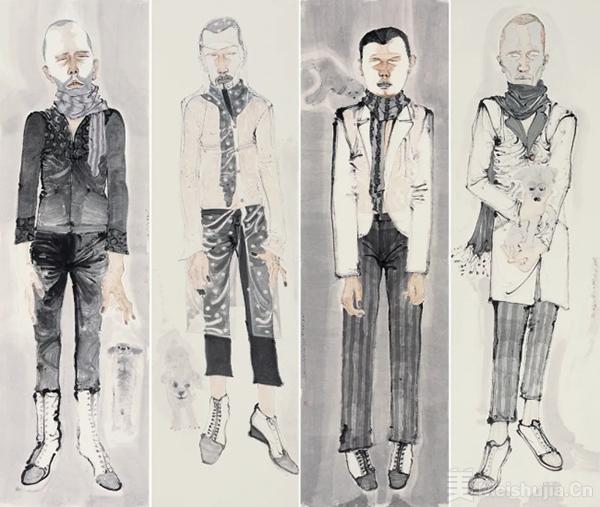 “遛狗”系列则将视角转向人与动物之间的微妙关系。海德格尔曾提出“共在”(Mitsein)的概念,即人总是处于与其他人的共同存在之中。然而,在现代技术主导的社会中,人们会陷入一种“公众意见”的陷阱,失去了真正的自我和深度的人际联系。当人们感到被社会压力所压倒或无法找到真实的同伴时,他们可能会转向动物寻求安慰。狗等宠物能够提供一种直接、非评判性的互动方式,这可能是现代人在复杂人际关系之外寻找简单纯粹的情感交流的原因之一。在这一系列中,秦修平通过夸张而怪异的造型和阴郁的画面气质,传达了现代社会中人际关系的疏离感,捕捉并深刻探讨了都市生活中人际关系的微妙变化,以及现代社会中的孤独感与疏离感。