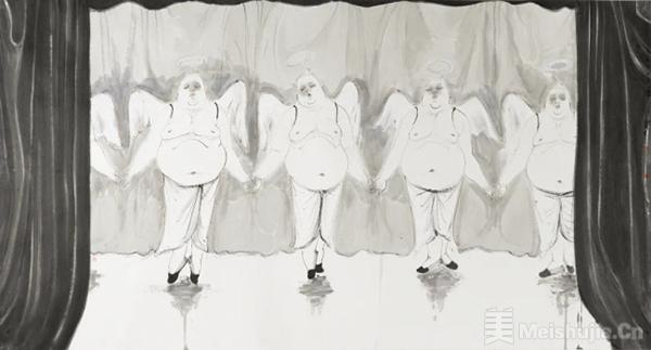 “胖子”系列则通过描绘肥胖者的形象,深入探讨了现代社会中人们对身体形象的焦虑与自我认同的问题。本雅明认为,随着传统生活方式的瓦解,人们越来越依赖于物质世界和媒体来寻找意义和支持,这种趋势下,自我往往幽深不可见。秦修平恰恰是凝视了这些幽深和不安,所以用漂浮、膨胀、冗余的身体在场作为视觉语言,作为一种对抗幽深不可见的呐喊和强调,构建了一个充满粘稠感、凝滞感、幽暗感和不确定感的空间,引发观者深思。