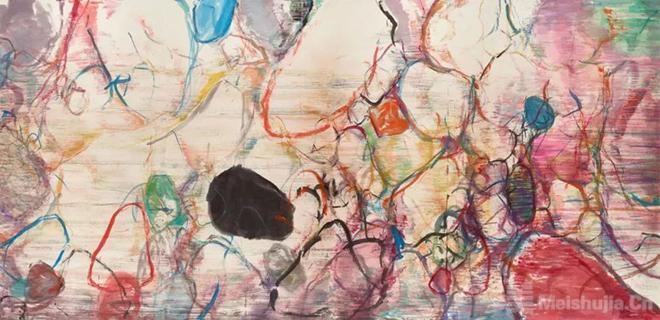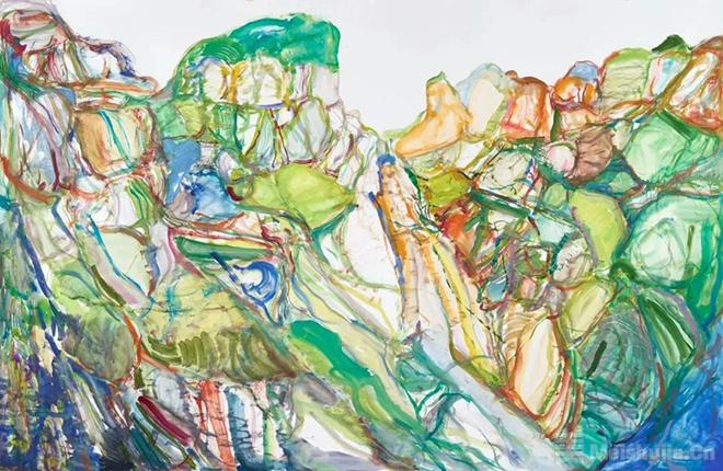 “山外”源于艺术家向外观看的彩墨大风景系列作品,从《荒石》系列抽象表现的主观性色彩表达,到“山外”彩墨大风景系列笔墨与线条的表现性与抽象性,党震经历了一个由主观创作到写生状态转换的过程。近些年来由于写生次数和书法课徒的叠加累计,彩墨大风景的色调与线条越发自由奔放,尤其在终南山的写生经历使得他内心获得了无比的从容与释放。
