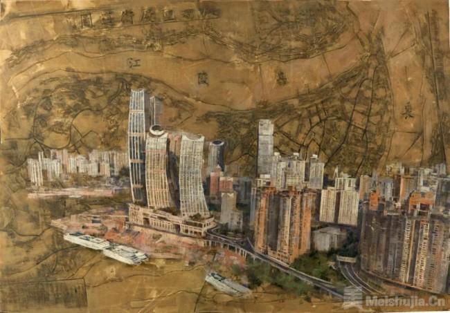 《梦幻之都》是重庆今天发展成一个现代化大都市的缩影,如果拿它和几年前画的《造城》对比来看,会发现《梦幻之都》的色彩相当跳跃,对比也很强烈,整个城市就像被霓虹灯所包围一样,似乎给人一种不真实的感觉。但我想说,这恰恰是我眼中重庆真实的样子。这幅画取材于重庆的夜景,因为这几年在做“光彩工程”,重庆夜间的灯光建设也成为了一个有名的景观,夜晚的重庆就笼罩在这样光怪陆离的色调之中,这样的城市确实是每天存在于我们的生活中,我们就生活在此,所以它是真实的;但它又是梦幻的,不只是因为灯光和这种景观式的视觉效果产生的虚幻错觉,更多的是在这样绮丽的景观背后,还重叠着这座城市以前的样子。因为生活经历的不同,每个人看到的重叠的景象也不尽相同,其实大家所见都是自己的记忆,也就是自己生命的痕迹。在这座城市里,每个不同的生命过往重叠在这样的景观背后,层层叠叠,它能不梦幻吗?在这幅作品里,有很多感悟与思考:我们既是生活在城市中的人,又是城市景观的观众,在一座高速发展的现代化城市中,我们怎样在这里留下自己生命的痕迹?当我们老去或是离开这个世界,我们怎样告诉这个城市,我们曾经来过?我想,我的作品会留下来说出这一切。