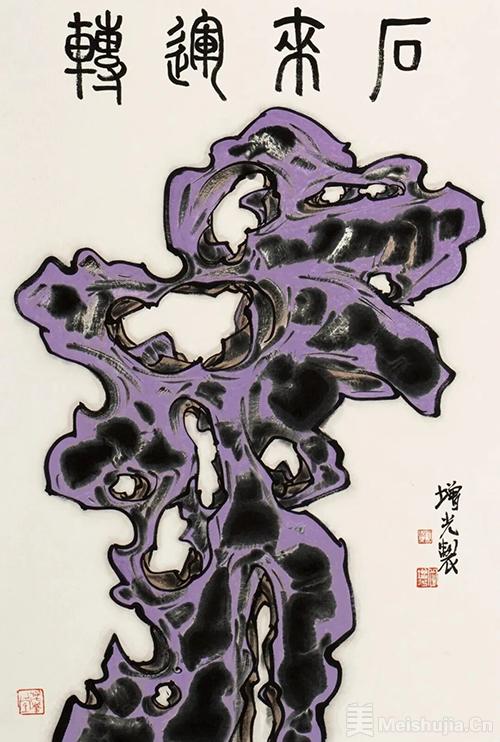 此次展出的赏石作品,是岳增光艺术探索的一次全新突破——他将青绿山水的创作技法与赏石题材完美融合,让笔墨的韵律与奇石的肌理相互交织,形成了独树一帜的艺术表达。在他的笔下,赏石不再是简单的自然物象复刻,而是承载着情感与寓意的艺术载体。其中,青绿色的赏石作品,延续了他青绿山水的经典色调,石身晕染的青黛与翠绿,似远山含黛、近水凝烟,将太湖石的清润之气与山水的空灵之境融为一体,观之令人心静神宁;红色的赏石则洋溢着热烈奔放的生命力,朱砂般的色彩浓艳而不失雅致,笔触遒劲有力,既凸显了奇石的嶙峋之态,又暗合“红运当头”的美好寓意,传递出积极向上的生活期许;紫色的赏石作品则更显典雅深邃,淡紫、深紫层层晕染,辅以留白与墨线勾勒,石形苍劲而不失灵动,恰应“紫气东来”的传统吉兆,蕴含着祥瑞安康的美好祝愿。