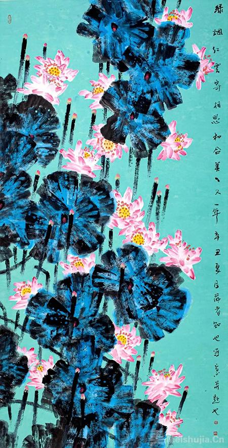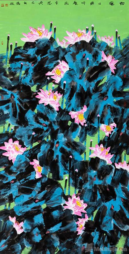 赵先闻常言:“前一个‘我’是主体性,后一个‘我’是个体性。”这一辩证表述,揭示了其艺术实践的核心命题。在《三思图》中,闭目沉思的鸟既是对“澄怀观道”的延续,又以拟人化姿态凸显个体的存在焦虑;《和风·与国同庆》蓝墨相间的勃发荷丛,则以满构图打破传统留白的虚空哲学,将文人画的“出世”情结转化为对生命强度的热烈礼赞。这种创作意识的转变,折射出改革开放后中国艺术家的集体觉醒:当传统文人“寄情山水”的生存语境消逝,现代艺术家必须在“入世”与“超然”的夹缝中重构主体价值。赵先闻的“色彩狂欢”与“构成实验”,实则是以视觉革命完成对时代精神的应答。