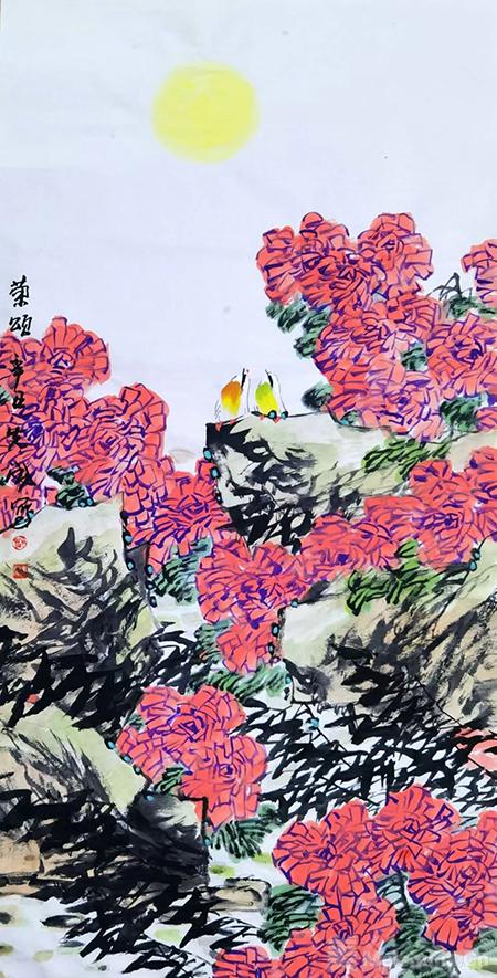 文人画对色彩的疏离,本质上是农耕文明下“天人合一”观的视觉投射。赵先闻敏锐地指出传统文人画的“两大软肋”——色调与构成,并以近乎叛逆的姿态发起双重革新。在《菊颂》中,血红菊丛与嶙峋巨石的并置,一对鸟儿蹲于石头,并不温柔姿态,而是对着太阳引颈高歌,无论是鸟儿的姿态,还是画面的高饱和色,都是将文人画的“含蓄”转化为现代艺术的“表现”的尝试。