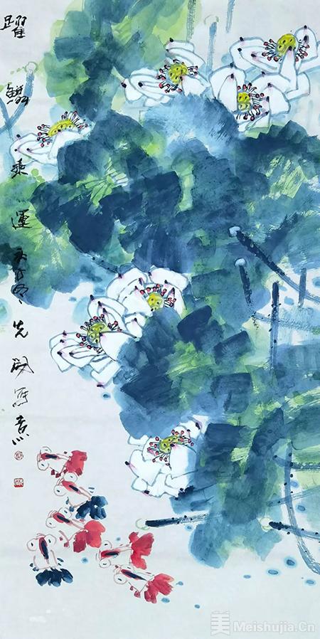 《跃鳞》则以平面构成原理解构“折枝”程式,荷叶的疏密排布暗含黄金分割律,鱼的游动轨迹形成视觉引导线,使画面在秩序与灵动间达成微妙平衡。这种对“点线面、角方圆、黑白灰、红黄蓝”的理性归纳,既是对包豪斯构成主义的借鉴,亦暗合《周易》“观物取象”的东方思维——艺术的现代性,终须以本土逻辑为根基。