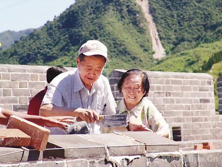 在罗哲文的影像记录中,有一张有意思的照片,那是他在长城上为王定国老人演示长城城砖的砌筑方法。
