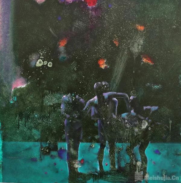 近几年他的作品转向抽象写意,融汇了表现手法,但场景切换为人物为主,依然是刻画一种虚拟的场景,仿若舞台剧,人物动作动态各异,象征着生命的波澜壮阔,又千姿百态。这种剧场化大处落笔,总貌概括,但不失细腻,直面它们又如身临其境,观者被包绕在其中,一样地感受生命剧场的起伏跌宕。
