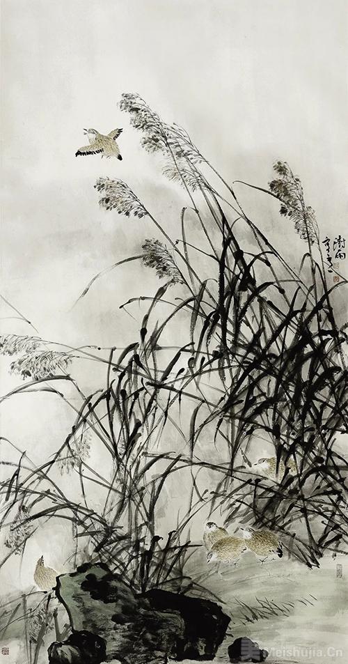 在阴澍雨的画上,有几方印常能见到,一方是“气若风云”,一方是“如水”。从其中可以约略感受到画家的艺术理想。不论是“风云”还是“水”,均是千变万化、莫可名状,而且平淡天真、无需雕饰,但是又具有宏大的气魄。这些品质与阴澍雨的花鸟画的确相当吻合。他的画没有什么故作奇俏之处,也不渲染戏剧性的对比,无论是构图、笔墨、设色,都给人一种平和的美感。在这里,“画如其人”的古训似乎能够得到很好的体现。阴澍雨的性格恰如他的画面一样不事张扬,而是内敛平和。当然,对于观者来说,画家的性格并非考虑的对象,画面的性格才是欣赏的重点。阴澍雨画中这种“如水”的平静格调,其实在很大程度上来自于对古代绘画的研读。