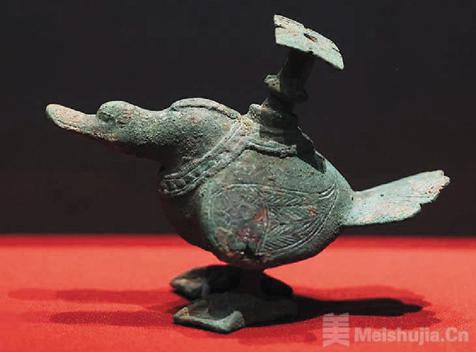 1984年江苏扬州甘泉老虎墩墓葬出土的东汉“飞熊形玉砚滴”,此器是目前发现出土最早的玉制砚滴,以此推理,砚滴最迟不会晚于汉代出现。砚滴最早为铜制和玉石等材质。汉代砚滴样式多为汉代已有飞熊、卧羊、辟邪、鸠凤,古朴浑厚。如首都博物馆藏汉代鸭形铜砚滴(见图二),此器为鸭形背负一注水器,鸭头部微低,缩颈。颈下系一条环带用以固定背部水柱,尾部翘起,双足落地,双翅以阴刻来展现其羽毛的质感,小巧可爱,是美观与实用皆备的器具。
