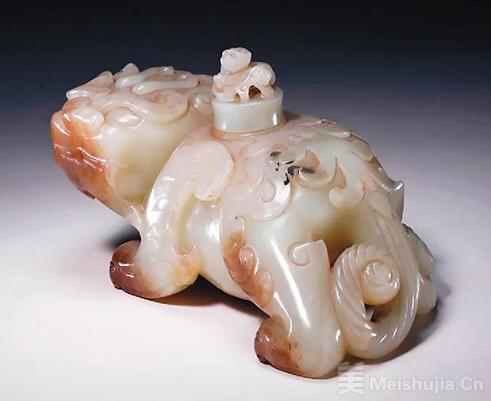明清时期,瓷砚滴主要由景德镇窑烧制,产品造型分为两个方向,一是延续各类像生造型,二是壶形砚滴大量生产。像生类砚滴为高端产品,多以颜色釉、素三彩等作为器表装饰。如故宫博物院藏青玉异兽砚滴(见图四),砚滴青玉质,利用玉斑圆雕作异兽形,兽背上驮有一水注,为贮水口,圆形水注上又雕饰小兽。此器造型别致而又不失工整,为清宫造办处玉作的制品。
