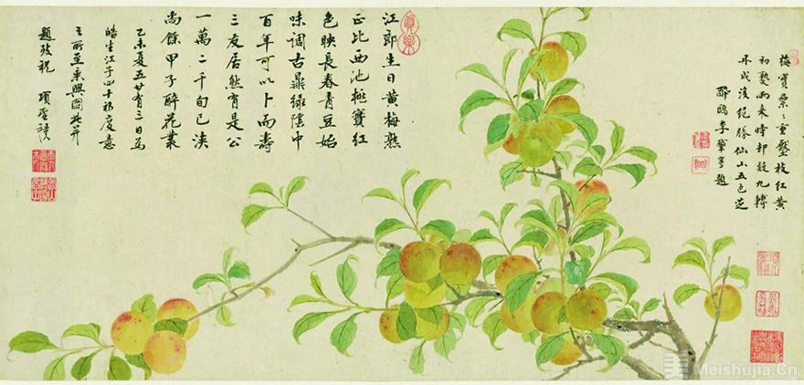 在为友人寿辰而作的《青梅初熟图》卷中,项圣谟以自然之笔书写时节生机:正值青梅成熟的时节,画面中梅树枝干以淡墨勾勒,间染赭色,苍劲中透着蓬勃生机。树梢嫩叶渐染嫩绿,似有新芽萌发。果实青黄相间、圆润饱满,叶脉以细笔勾写,疏密有致。整幅画卷将梅树的繁茂、果实的丰腴与友人之间的情谊,定格为永恒的夏日祝福。