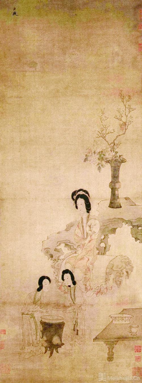 画面中,新鲜梅子正经历烹煮去涩的工序。两名侍女于火炉边专注操作,一人托梅盘而立;一人执勺搅动,并欲取盘中梅子投入沸水,蒸腾热气似透过宣纸扑面而来。一位妇人端坐石凳,手持团扇神态温婉端庄,静候梅子调制完成。画面设色淡雅,瘦骨嶙峋的太湖石、线条简练的古朴几案与清丽花枝相映成趣,营造出疏朗清雅的文人意趣,让观者仿若置身画中,共赴这场煮梅的雅事。