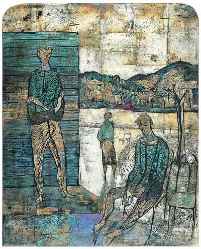 《山间微风》的创作灵感,是我在山间度假时获得的。夕阳西下,远处的山脚下村舍绵延,河水缓缓流淌,我和朋友在民宿墙角的阴影中或站或坐,一瞬间仿佛都被暖暖的斜阳迷醉了,大家安静下来,感受到初夏山间的一阵微风。那是一种很美妙的感觉:初夏是一个充溢着生命力的季节,拂面的是律动自由的风之气息。回到工作室,我心中总是忘不掉夕阳下的那一刻,便想用作品记录下来,不在于对现场的还原,更着力在对感觉的呈现。