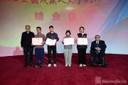 图为中国助残志愿者协会会长吕世明、中国残疾人事业新闻宣传促进会会长张伟为学员颁发优秀学员证书