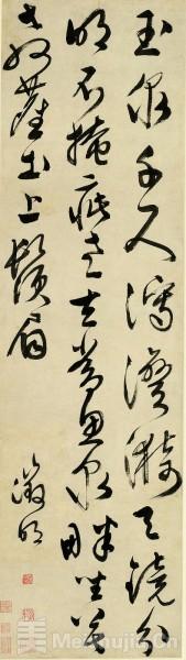 弘治十一年(1498年),唐寅中南京乡试解元。然次年春入京会试,因科场案牵连入狱,黜发为吏而不就,归而筑室于桃花坞,笔耕砚田之中。此诗内容即科场案后落魄生涯之自况,意绪落寞之中,不乏超逸洒脱之趣。其书法以行书为主,启功先生认为他没有明确的摹古线索,大要而言出入于松雪与北海之间。此轴乃其晚年所书,其结体欹侧,即仿李邕一路;运笔圆转,乃参松雪之意。