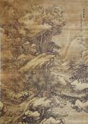 在构图上,画家巧妙地安排了近、中、远三景,形成了一条清晰的视觉路径。近景处,溪水尚未完全封冻,旅人正小心翼翼地踏石过河,身后牛车满载货物。中景的山腰处,一支驮着货物的商队正沿栈道缓缓前行,还有一个旅人挑担独行在曲折的山道上。远处,重峦叠嶂,淡墨皴擦出嶙峋山骨,留白处即积雪,于雄浑中透出天地俱寂的空灵。