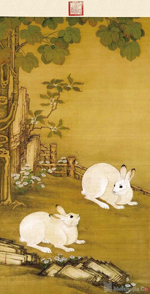 此图中的桂树高大挺拔,枝繁叶茂,桂子飘香,各种野菊花竞相开放,争芳斗艳。树下绿茵遍野、铺青叠翠,巉岩、湖石高耸,嶙峋峻峭。一只玉兔前左脚提起,仰头凝视前方,目之所及,一轮圆月悬挂天空,另外两只灰兔旁立,顾盼生姿。此图用笔工细,一丝不苟,构图丰满,但繁而不乱,意境清幽。