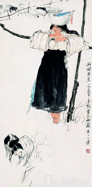 为了探索和实践中国画线描技法对少数民族服饰的表现,离开敦煌返校途中,一行人又兴致勃勃地前往武威市天祝藏族自治县进行了一个月的速写写生。周昌谷在日记中写道:“这个地方对我来说新奇得不得了,画兴大发,每天背着画夹,激动得很,这个地方太美了,太吸引人了,每天都画了许多素材回来。”可以想象,这批刚接受完传统艺术熏陶的年轻画家们,一接触到火热的现实生活,必然会产生强烈的创作冲动。也正是在这期间,周昌谷创作了《两个羊羔》。画面中,天真可爱的藏族少女神情专注地凝视着两只初生的羊羔,充满对生命的爱怜。画作以水墨为主,通过简洁的线条塑造出灵动的人物形象和清爽的画面氛围。可以说,这幅作品的诞生,是画家在传统艺术与现实生活的双重滋养下生发的结果。返校后,师生们的部分摹本被选编入《敦煌壁画临本选集》,周昌谷临摹的莫高窟第217窟壁画局部还被选为1957年《美术研究》创刊号封面。