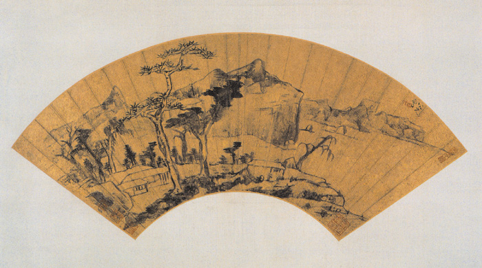 朱耷的此幅山水,看不出是哪家的点?哪家的皴?画面中浓的淡的、横的直的点划短线,组合构成画面的节奏和意象,宛有西洋印象派和点彩派的效果,而其内涵,显然更加厚重,深沉而丰富,体现了中国笔墨特有的审美价值取向。从布局的处理来看,有点近于元代画家倪瓒的章法,然而倪瓒却没有如此错杂的寒林和高耸的山峦,那冈峦的峻拔近于黄公望的造景,显得雄伟奇峻。