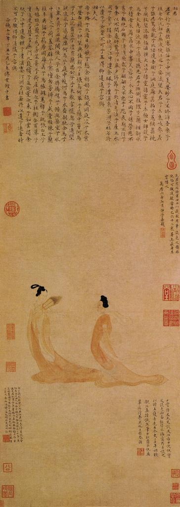 文徵明(1470—1559),原名壁,字徵明,后以字行,更字徵仲,号衡山居士。长洲(今江苏)人,与沈周是同乡,并师事沈周。他是“吴门四家”中沈周而下的第二位大家。《湘君湘夫人图》是根据诗人屈原的《九歌》中的湘水女神的形象描绘的。此图画法简洁明快,无背景衬托。人物的衣纹作高古游丝描,细劲而舒畅,有益表现湘君、湘夫人在空中款款而行的动态,给人以飘飘若仙之感。在颜色运用上,主色只用朱膘、白粉两种,形象古意中见灵动。