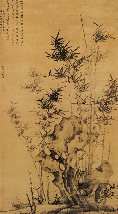 顾安作为元代画竹大家,以平生之力专攻墨竹,又集宋元两代画竹大师文同、赵孟頫等人优长,最精于风竹雨叶,其清劲生动之格,尤为时人及后世推崇,人称其画“清如李息斋,劲若柯丹丘”,观此图,知其誉不虚。本幅有王谦和高士奇等四家题记,有乾隆等鉴藏印迹二十六方,曾入《石渠宝笈初编》等书著录。