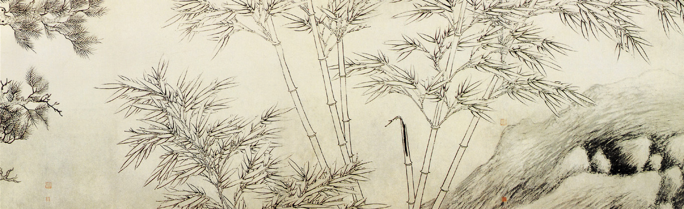 张逊,字仲敏,号溪云,吴郡(今苏州)人。善画竹,作钩勒法。张氏用“钩勒之法,殆若绝响”。有“妙绝当世”之评。《双钩竹图》画土皮又钩竹二丛,中间巨石,接画古松偃卧高坡,稍间枯树数枝,其后以古木老干,平坡丛所收尾。画面陂陀间松竹飘拂偃仰,姿态横生,坡石用中锋圆笔乾皴,双勾飞白竹,笔法劲利凝练,枝叶繁而不乱,疏密有致, 极得扶疏潇洒之意。