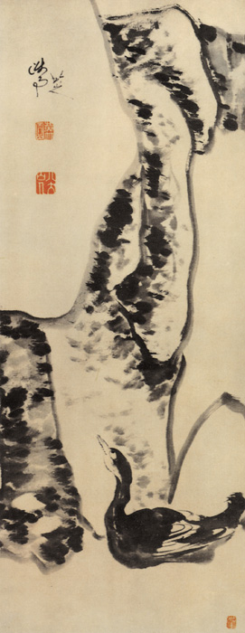 朱耷(1626—1705),字雪个,号八大山人,南昌人,是明朝宗室,明亡,出家为僧。其画气势雄阔,精力充沛,笔简意赅,在清初水墨写意画派中,是有独特风格的大画家。晚年艺术造诣达于高峰,凝重浑厚,丰茂拙朴,在造型上更见简练。此图画鸭,昂首凝视,神态如生。