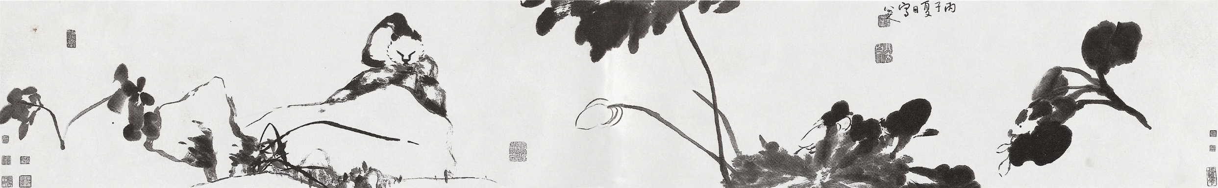 朱耷擅画山水、花鸟、竹木,笔墨简括,笔情恣纵,不尊成法,无论大幅还是小幅都有浑扑酣畅而又明朗秀健的风神韵致。他的花鸟画成就最高,所画一花一鸟,不只注意多与少、大与小,更注重布局上的地位与气势。此《猫石花卉图》结构奇特,不落俗套,生意盎然,无景之处亦成妙境,别具灵气。自题:丙子夏日写。