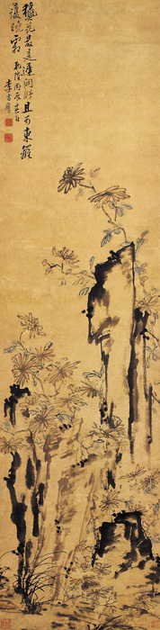 李方膺(1695—1755),字虬仲,号晴江,又号秋池,江苏通州人,为“扬州八怪”之一。他善画梅、兰、竹、菊,尤以画梅著称,把自己的居室命名为“梅花楼”。画笔倔强纵横,不守寻常法度,但乱中有理,有莽苍浑成之概。此图绘菊花和文石,用笔恣肆飘逸,很有力量感和形式美感。