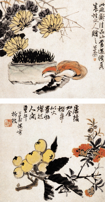 此册页共十二页,分别描绘苍松、秋菊、寒梅、玉兰、枇杷、荷莲、梧桐、竹石、寒林等。此选两页,用笔松秀,清逸明丽。 画上有画家自题。