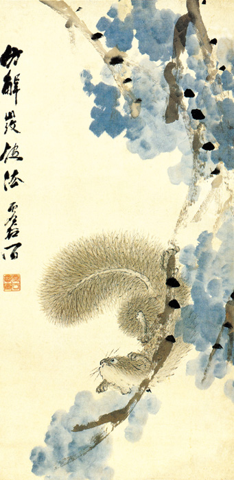 本幅自识“仿解馆法,虚谷画。”钤“虚谷书画”。此画取景于一只活泼的松鼠在夏日静谧的树林中飞跃跳荡的瞬间。晶莹香甜的葡萄引来了这只小动物。画家以干硬的细笔画松鼠丰厚蓬勃的皮毛和调皮灵活的动态,它那圆睁的双眼,龇起的胡须,奋扬的前爪和翻卷的长尾巴,使画面洋溢出喜悦欢快的野趣。