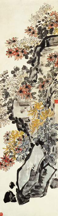 一块大石布满了画面绝大部分,钩花点叶,布列有序,黄、红、白三色,各色菊花艳丽芳菲,争妍斗奇,形成一幅缤纷斑斓的立体画卷。陈师曾画菊有时寓有身世之感,如他为贺吴成再婚画的一幅菊花上题菊花诗云:“事往去年花,今年岂无再?从容续坠欢,俯仰发新慨。写此诗赠君,愿与人常在。”画家悼亡两次,结婚三次,对于朋友的再婚,自然会引起自己的感慨。他画菊,有时以草书笔法,一气呵成,可谓千姿百态,巧夺天工,给人美的享受。