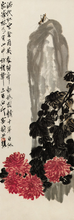 齐白石(1863—1957),中国近、现代中国画家、篆刻家, 原名纯芝, 后名璜, 字渭清, 又字兰亭, 号濒生, 别号白石山人、寄园、寄萍堂主人、阿芝、三百石印富翁、湘上老农等。齐白石生于湖南省湘潭县农家, 他自小砍柴, 上了半年村馆就学木匠, 给人作雕花家具。此幅作品,笔墨与构图,俱臻佳妙,一叶红菊,斜垂画中,色彩鲜妍,视以淡墨石头,气势峭拔,石上著一纺织娘,更添生趣,自题云:“满地红云粲菊英,题诗牵动故园情,十年百劫家难想,可有山中纺绩声。”