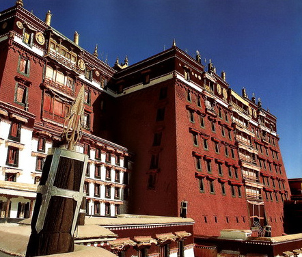 红宫建于1690年,当时,清康熙帝还特意从内地派了100余名汉、满、蒙工匠进藏,参与扩建布达拉宫这一浩大的工程。红宫的主体建筑是各类佛堂和达赖喇嘛的灵塔。宫内有8座存放各世达赖喇嘛法体的灵塔,其中以五世达赖喇嘛的灵塔最大最华丽,塔身用金皮包裹,镶珠嵌玉,据说共用黄金11万余两,珍珠、宝石、珊瑚、琥珀、玛瑙等18677颗。红宫中最大殿堂“司西平措”(西大殿)面积725平方米,殿内正中上方高悬乾隆所赐“涌莲初地”匾额,设有六世达赖喇嘛宝座。殿中还存有清康熙帝赠送的大型锦帐一对,是布达拉宫的珍宝之一。殊胜三界殿是红宫最高的殿堂,一旁的经书架上,还置放着雍正皇帝赐与七世达赖喇嘛的北京版《丹珠尔》经书。红宫最西是十三世达赖喇嘛灵塔殿,高14米,传说殿内的坛城是用20余万颗珍珠串缀而成的。