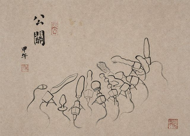 这一系列的作品借用了传统文人画的外壳,诗书画印一应俱全,以拼接、讽喻、戏谑、拟物等方式揭露了包括艺术家自身在内的现代人的精神现状。画中体现的信仰缺失,消费疯狂,技术操控着人,充斥着符号和虚像的“景观社会”,人们身处的焦虑困境是中西共通的。主题从老庄到圣经,从儿时记忆到文人情趣,从神鬼志怪到网络轶事,看似插科打诨甚至有些无厘头。