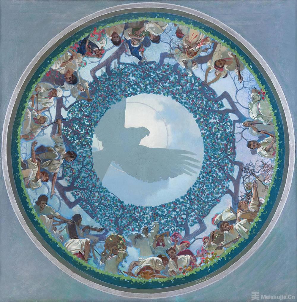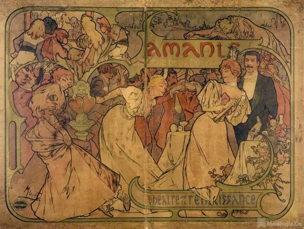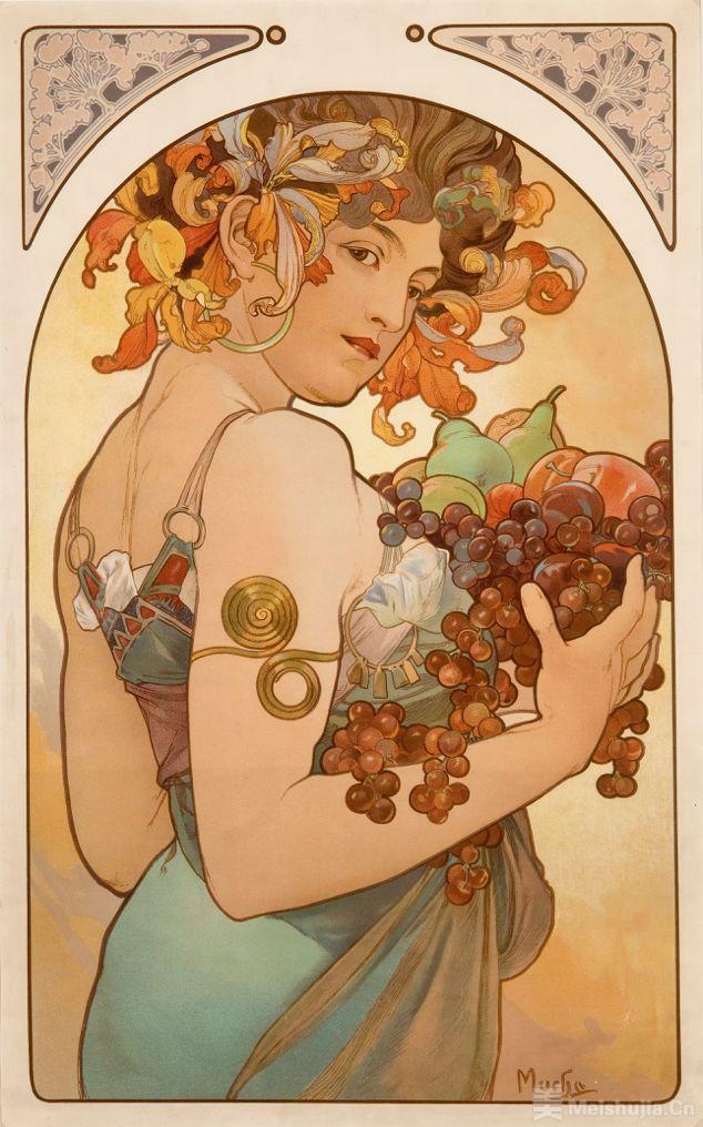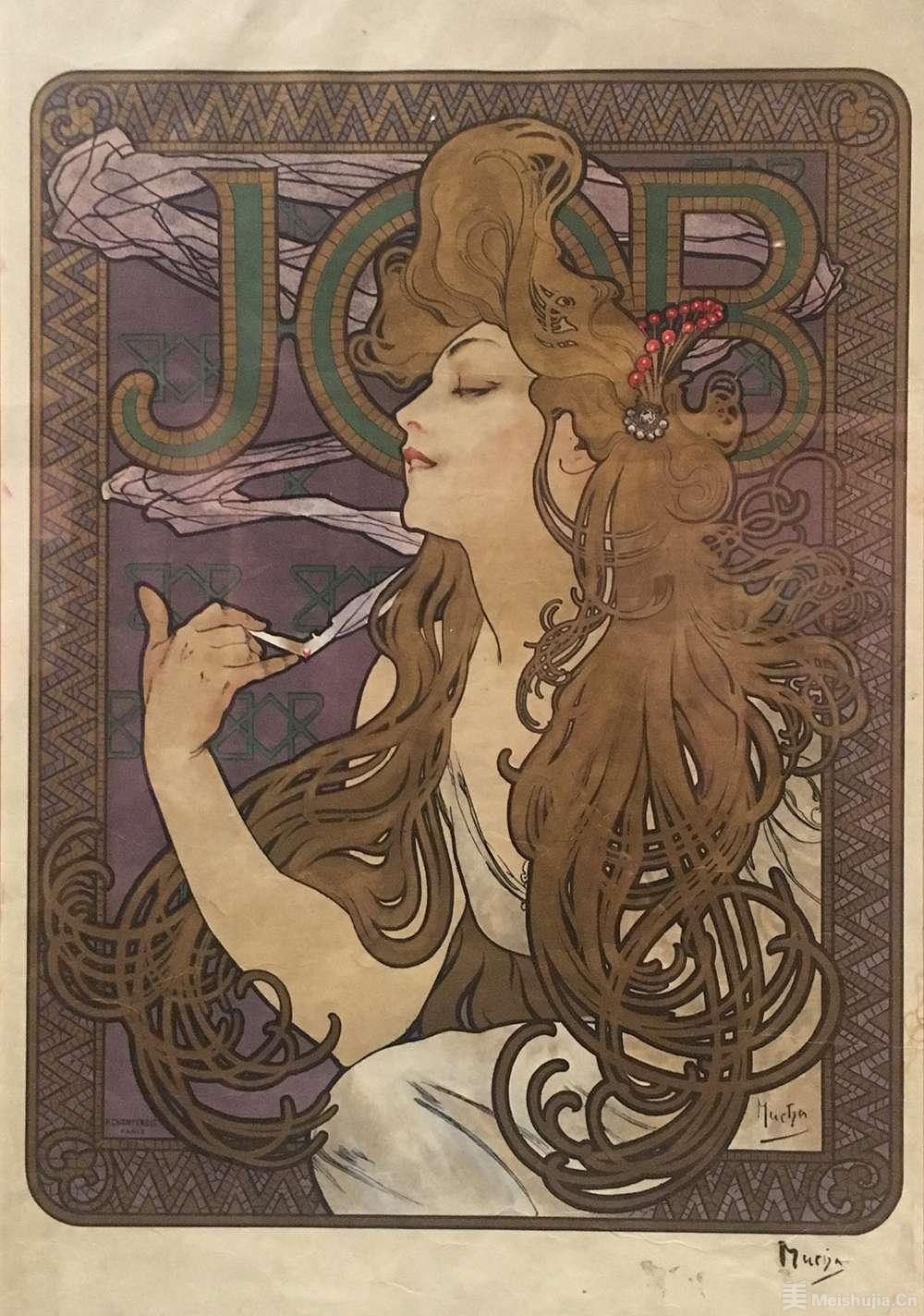 穆夏1860年生于捷克,是新艺术运动的先锋。他的创作涉及几乎所有艺术领域,涵盖油画、招贴画、雕塑、书籍插画、建筑设计、室内装饰、首饰设计、彩色玻璃窗画等,还有家具和咖啡壶等生活用品的设计、以及大量的商品包装纸等商业性绘画。