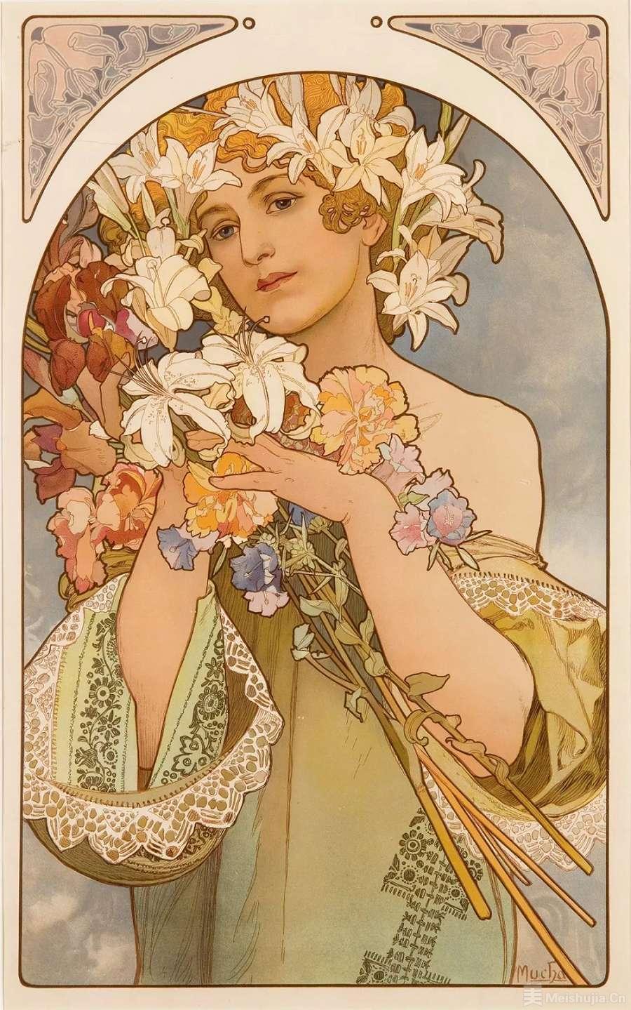 穆夏早期的海报、装饰画等以韵律化的线条、简洁的轮廓线、明快的水彩效果为特征,描绘的女性形象婀娜柔媚,人物周围以植物花纹曲线装饰。晚期风格多样化,更加自由奔放,为祖国创作了《斯拉夫史诗》等巨幅油画。