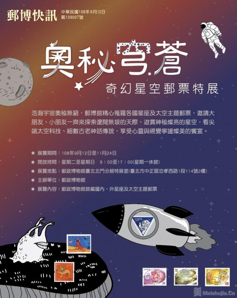 本次展览将展出台北邮政博物馆从世界各国搜集的星座及太空主题邮票,邀请成年人和儿童一起探索辽阔的天际,了解现代太空科技和古老神话传说。