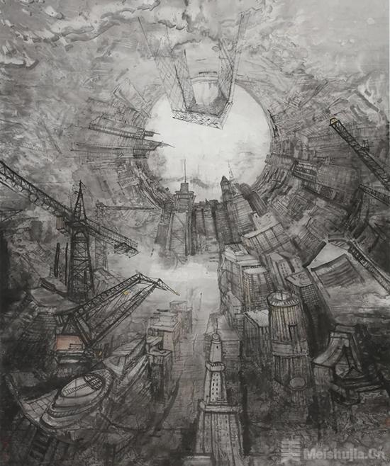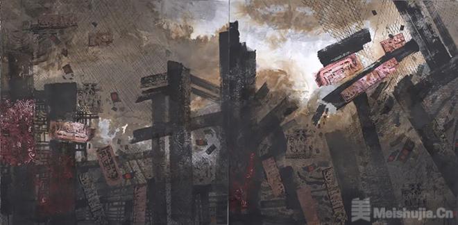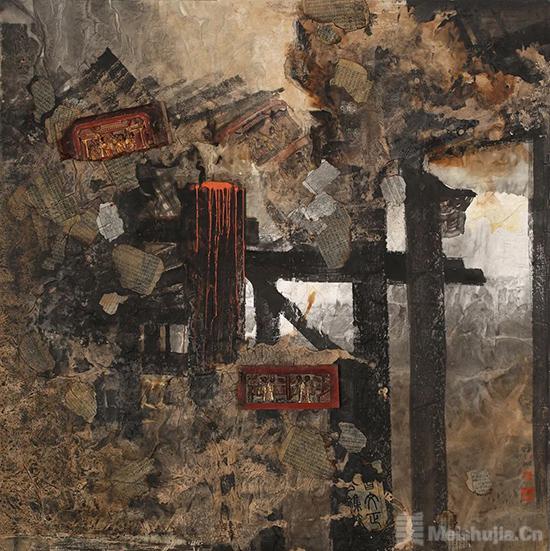 综合材料艺术是邹明近年来探索的一个新领域。与水墨艺术相比,综合材料创作更体现出邹明独特的视觉思维,以及对不同材料的匠心独运。《拓荒岁月》《火红岁月》《苍茫》等笔力雄强,而意象荒荒。在混沌恍惚的墨色中,在水与纸的交融中,抽象形态绽放出动人的光彩。另如《老屋遗韵》《残梦》《血色浪漫》,全以色彩的互动关系来营造画面,浓烈而深沉的暖色调似乎从遥远的梦中浸润而来,热烈而沉着,完美地诠释了画面的主题。邹明利用了材料的流动特性,让色与墨自由流淌,相互冲突、融合,纠缠在一起。色与墨不再是世间物象的叙事者,而是成为沟通天地的灵魂,在精神的广袤空间里作逍遥游,气魄如《庄子》所言“水击三千里,抟扶摇而上者九万里,去以六月息者也”。