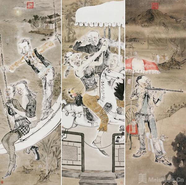 “游园”系列标志着秦修平当代艺术探索的起点。列斐伏尔强调,空间不是静态的背景,而是由社会关系和社会实践动态生成的结果。对于秦修平来说,这一系列作品不仅是对物理空间的表现,更是一种社会空间的生产。秦修平的作品捕捉到了现代城市居民在所谓“公共”空间内的活动,揭示了日常生活中人们对这些地方的实际使用情况——即它们是如何被占据、改造甚至侵占。传统园林元素被重新诠释并融入到现代城市的背景之下,这种处理手法体现了艺术家对于理想化自然景观与现实都市景象之间张力的理解。同时,它也暗示着一种新的美学观念正在形成,这种观念既保留了传统文化的记忆,又适应了现代社会的需求。他的画作不仅仅是一幅风景图,而是承载了个体记忆和社会历史的空间叙事。他通过对这一主题的深入观察与表达,揭示了现代化城市进程中公共空间的私密化与封闭性。该系列展现了他对传统绘画元素的现代重构能力,以及对当代文化语境的深刻洞察。
