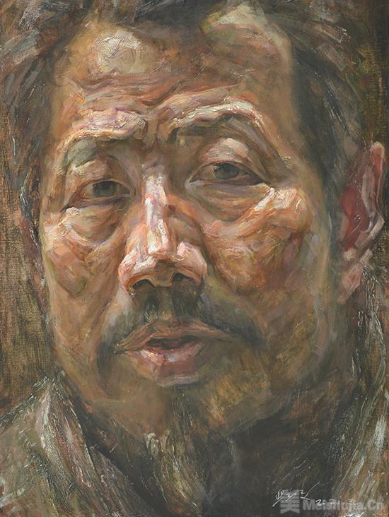 坚定而怅然的目光,这是刘亚明青年时期的两张《自画像》(1995)为我们留下的生命印象,浸透着华夏士人自屈原以来的忧患意识。伴随岁月的熬炼,他发现一个艺术家真正的价值,不仅在于他表达了什么,更在于他在艺术语言方面如何表现。这构成他创作三张巨作的内在文化动力。同时,画面中的每个人物形象,其实不过是他作为个体之人的生命情感长阔高深的外化显现,不过是他在人我关系中进入自己的灵魂深渊的向上涌泉。他的《2021自画像》系列(2021)与《自画像》系列(2024),更是他咽下被无尽囚禁的时代苦水后发出的浩然悲悯的视觉见证。其中,交织着不屑与愤怒、震惊与孤傲、仇视与厌恶、哭泣与哀挽、逼视与隐逸、无助与伤心、怀疑与批判、仁慈与共情、淡定与期盼、沉着与执念等的目光。